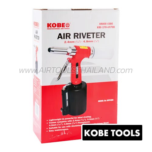 RPP480 For blind rivets with 3/32”, 1/8”, 5/32” and 3/16” nozzles. Comes with a plastic bottle to collect ejected pins. Air inlet thread: 1/4” NPT. Minimum air hose size: 10mm (3/8”). Air consumption: 4cfm (113ltr/min)*. Noise Level: 50dBA Sound Power: 61dBA Vibration: 0.55m/s Overall height: 274mm.*Based on a 15 second cycle per minute average use.
